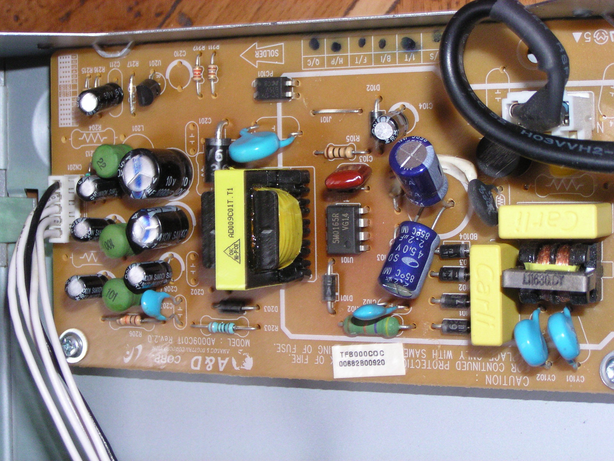 Если во вчерашнем Топфилде был шикарный конденсатор на 150 микрофарад, в сегодняшнем кабельном пациенте коненсатора целых два. Зато каких! Диагноз: глючит и перегружается. Судя по цвету платы возле SM165R, это на редкость качественный шим-контроллер, который непонятно как терпел практически незафильтрованные 50 герц. Ну а как попала внутрь пара тощих конденсаторов и как эта конструкция умудрялось работать раньше - загадка. Поправил, конечно же.