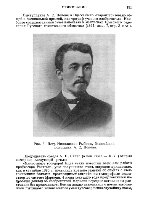 Примечание: Эйлер Александр Николаевич (1861—1921), потомок знаменитого петербургского академика; правнук сына Леонарда Эйлера (1707— 1783) Христофора (1743—1812), генерал-майора артиллерии, начальника Сестрорецкого оружейного завода. Активный член VI (электротехнического) отдела РТО, А. Н. Эйлер проявил себя как видный деятель, посвятив свои труды проблемам связи на железнодорожном транспорте; в последние годы жизни работал на Октябрьской железной дороге в качестве заместителя начальника службы связи. Возглавленный А. Н. Эйлером съезд начался с его доклада «Об одновременном телеграфировании и телефонировании по одному и тому же проводу», вызвавшего оживленные прения (из книги: А.С.Попов "О беспроволочной телеграфии", 1959г.)